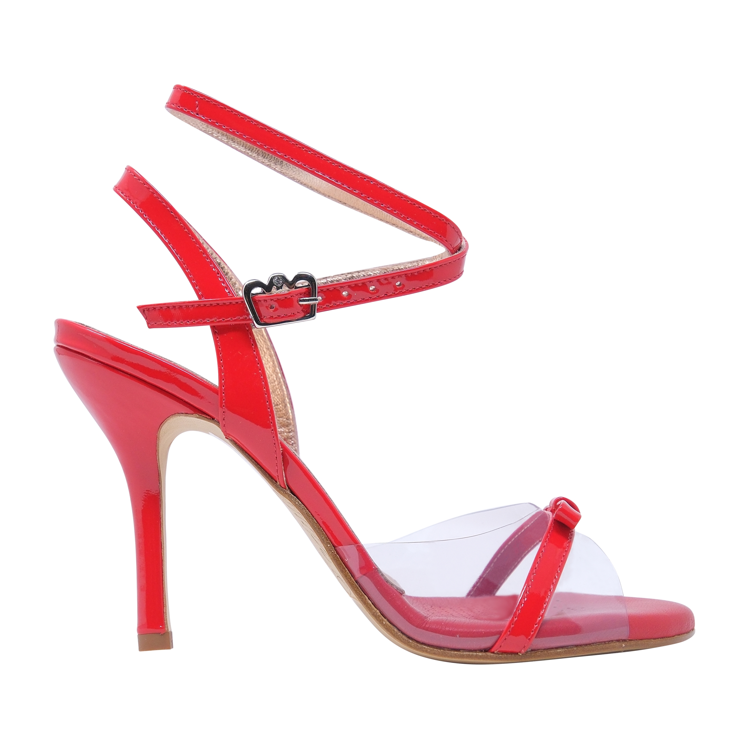 – red patent leather shoe with plastic front and a red bow leather